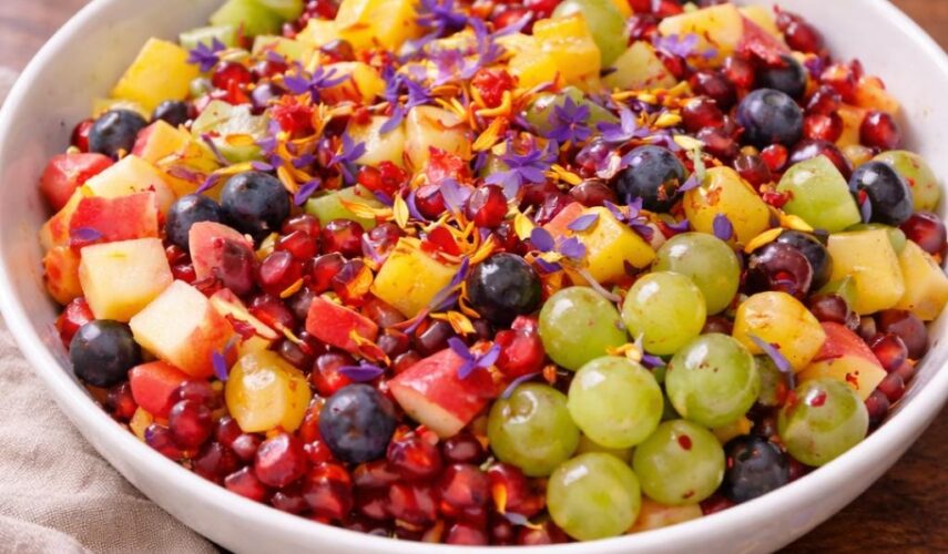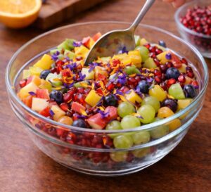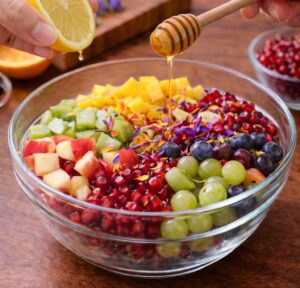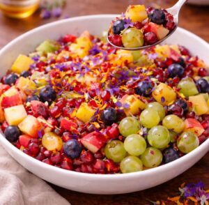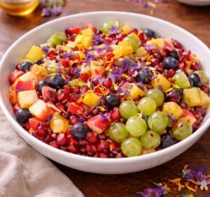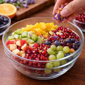 Sprinkle edible flower petals over the fruits. Think of them as little bursts of joy adding both beauty and subtle aroma to your salad.